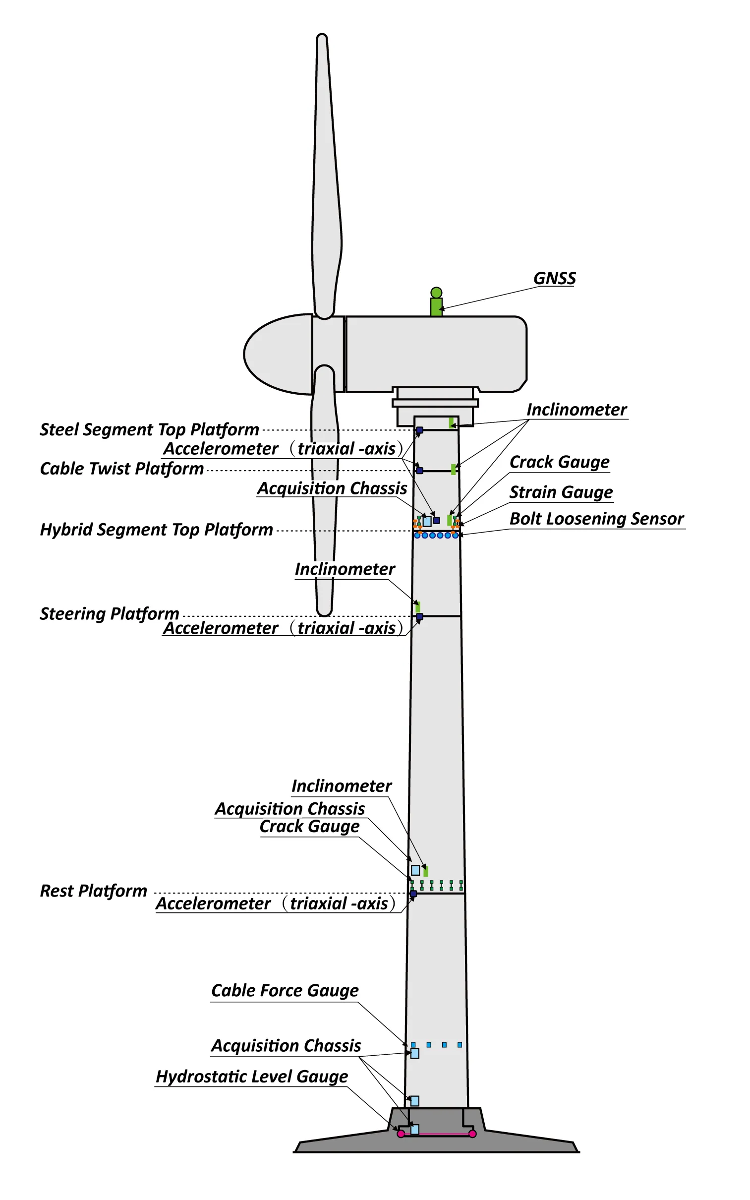 Asentamalla asiaankuuluvia antureita tuuliturbiinien torniin kunnonvalvontaa varten, tuuliturbiinitornin rakenneosien tärkeimmät valvontasisällöt tulisi sisältää: tornin tärinän valvonta, tornin kaltevuuden valvonta, yläsiirtymäosan jännitysvalvonta, tornirungon halkeamien valvonta, tornin siirtymän valvonta, tornin perustusten painumavalvonta, kaapelivoiman valvonta jne., jotta saavutetaan tavoite tuuliturbiinien turvallisesta käytöstä.